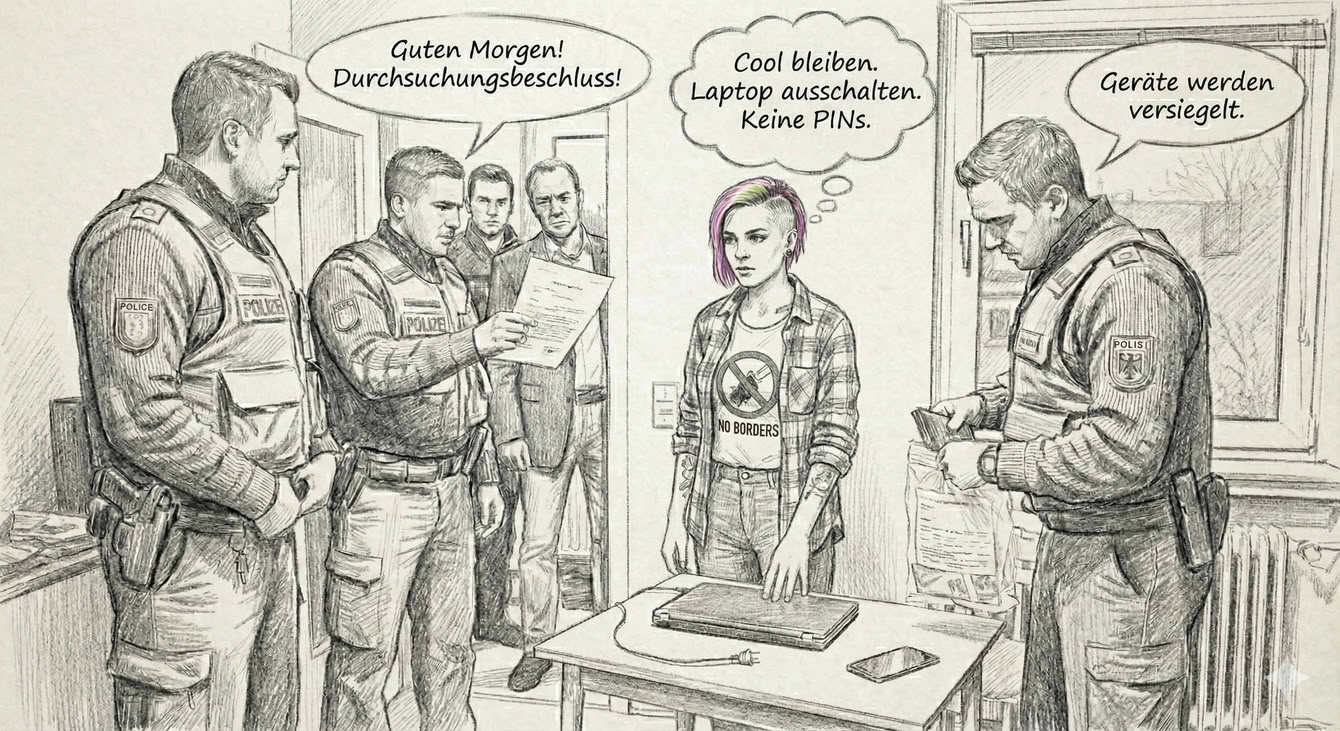 Guten Morgen Sonnenschein! Es ist 6 Uhr morgens und einige unfreundliche Beamt:innen stehen vor deiner Wohnung und erklären dir, dass sie nun eine Durchsuchung durchführen werden. Du bleibst natürlich cool und rufst dir in Erinnerung wie du dich in so einer Situation verhalten solltest.